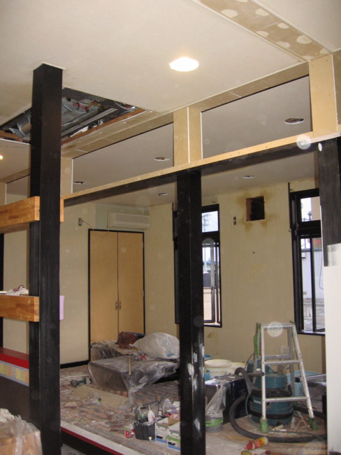 長野県飯田市座光寺 鉄板グルメ・お好み焼き 喜一さまの改装工事です。 店内の内装が油等で汚れております。 そこで店主さまより、内装の張替に伴い改装工事の相談を受けました。 既存全席にありました垂れ壁を撤去します。 店内の開放感と、空調の効率アップを兼ねまして計画します。 店内のリニューアル後のイメージは、『 大人の空間を演出したい 』とご希望を受けました。 鉄板グルメ・お好み焼き 喜一様改装工事 ・・・完成へ